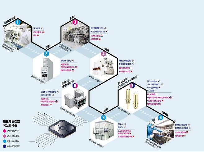 국내 기업은 틈새 전략으로 글로벌 점유율을 높이고 있다. SK실트론은 반도체 생산의 표준인 300㎜(12인치) 웨이퍼 생산에서 신에츠, 섬코와 선두 경쟁을 벌이고 있다. 노광 이후의 식각 공정에서 빛과 반응하지 않은 포토레지스트 찌꺼기를 제거하는 드라이 스트립 장비 분야에선 PSK가 2010년부터 램리서치, 히타치 등 글로벌 업체를 누르고 1위 자리를 지키고 있다. 주성엔지니어링(원자층 증착), 한미반도체(열압착 본더), 이오테크닉스(레이저 어닐링), 리노공업(테스트핀) 등도 세계 최고 반열에 올랐다.