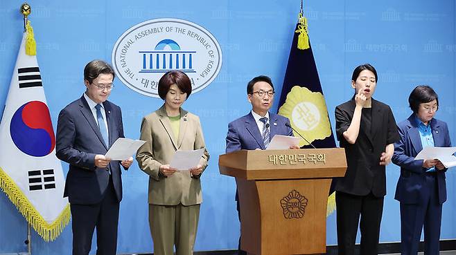 ▲ 더불어민주당 박선원 의원(가운데) 등 더불어민주당 국민소통위원회, 국무총리 인사청문특위 위원들이 30일 서울 여의도 국회 소통관에서 김민석 국무총리 후보자에 대한 허위사실 유포 고발 관련 기자회견을 하고 있다.
