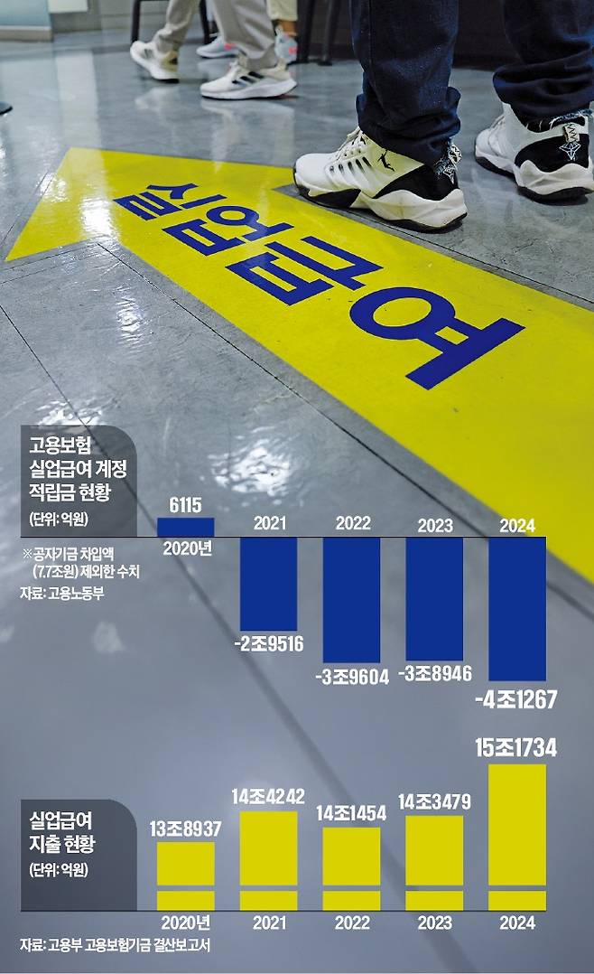 하지만 이는 고용부가 공자기금에서 빌린 돈 7조7208억원을 포함한 수치다. 이를 제외하면 이미 4조1267억원 적자다. 고용부는 기금 고갈을 막기 위해 2020년부터 2022년까지 10조6581억원을 예수금으로 빌렸고 이 중 2조9373억원만 상환하는 데 그쳤다.