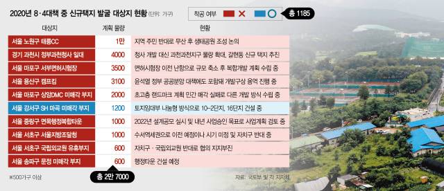 하지만 마곡 미매각 부지를 제외하면 2020년 정부가 발표했던 500가구 이상 신규 택지 중 착공에 들어간 곳은 전혀 없다. 당시 정부는 군부지, 기관 이전 부지, 공공기관 유휴부지 등 20여 개 국·공유지를 신규 택지로 발굴해 2028년까지 총 3만 3000가구를 공급하겠다고 밝혔다. 이 중 500가구가 넘는 대상지는 △서울 노원구 태릉CC(1만) △경기 과천시 정부과천청사 일대(4000) △서울 마포구 서부면허시험장(3500) △서울 용산구 캠프킴(3100) △서울 마포구 상암DMC 미매각 부지(2000) △SH 마곡 미매각 부지(1200) △서울 중랑구 면목행정복합타운(1000) △서울 서초구 서울지방조달청(1000) △서울 서초구 국립외교원 유휴부지(600) △서울 송파구 문정 미매각 부지(600) 등이다. 총 10곳, 2만 7000가구 규모다.