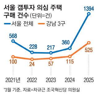 서울의 갭투자 의심 주택 거래는 2021년 6691건에서 2022년 1992건으로 부동산 시장이 불황을 맞으며 둔화했다. 하지만 서울 아파트 집값이 오르고 똘똘한 한 채 열풍이 불면서 2023년 2931건, 2024년 5238건으로 다시 급증했다.