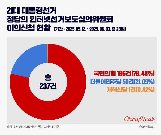이는 <오마이뉴스>가 정보공개청구를 통해 확인한 결과로 대선 공식선거운동 시작일인 5월 12일부터 본투표일인 6월 3일까지 총 237건의 이의신청을 분석한 결과다.