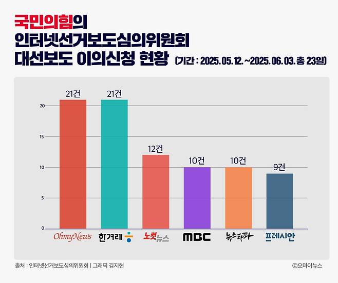국민의힘은 총 55개 언론을 대상으로 이의신청을 청구한 것으로 조사됐으며, 오마이뉴스와 한겨레가 각각 21건으로 최다였다. 그다음은 노컷뉴스(12건), MBC(10건), 뉴스타파(10건), 프레시안(9건) 순이었다. 민주당은 17개 언론, 개혁신당이 1개 언론에 이의신청을 제기했다.