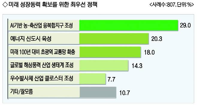 다음으로 전남의 미래 성장 동력 확보를 위해 최우선으로 추진해야 할 정책으로는 'AI 기반 농·축산업 융복합지구'가 29.0%로 가장 높은 응답률을 기록했다.