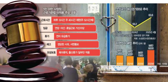 소상공인인 5인 미만 사업장의 경영 상황은 올해 특히 최악이다. 소상공인진흥공단에 따르면 소상공인 체감경기지수는 2023년 64.4였다가 지난해 59.2로 악화됐다. 올 4월에도 63.6에 그쳤다. 이 지수는 100 미만이면 경기 악화를 의미한다. 소상공인은 대출 규모도 많아 경기가 악화하면 폐업이 늘어난다. 2023년 폐업 사업자는 역대 최대 규모다. 약 98만 명으로 전년 대비 약 12만 명 늘었다. 5인 미만 사업장이 근로기준법을 적용받으면 결국 고용을 줄일 수밖에 없다는 우려가 소상공인 업계에서 나오는 이유다. 근로자 보호를 위해 근로기준법을 확대한 결과가 고용 감소라는 역효과를 낳을 수 있다는 것이다.