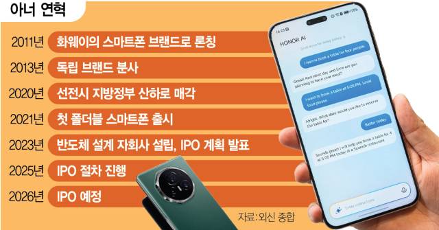 중국 스마트폰 제조 업체 ‘빅5’로 꼽히는 아너가 화웨이에서 분사한 지 5년 만에 기업공개(IPO)에 속도를 내고 있다. 아너는 내년까지 상장 절차를 마무리해 연간 3조 원에 육박하는 인공지능(AI) 투자 비용을 조달한다는 구상이다.