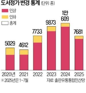 과거 정가 인상 종 수가 2022년 6223종, 2023년 8795종, 2024년 9798종 등 증가 추세인 걸 감안하면 올해도 역대 최다 기록을 갈아치울 것으로 보인다. 2014년 도서정가제 시행 이후 출판사는 정가를 변경하려면 전달 15일까지 이를 신고·공표해야 한다.