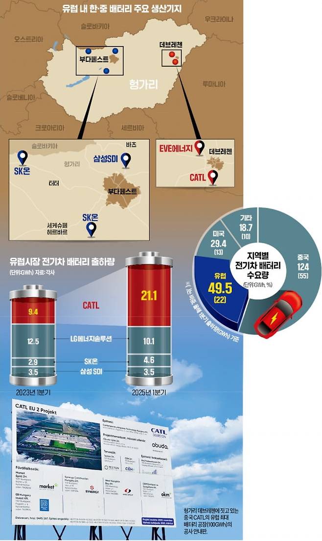 중국 ‘배터리 굴기’의 무대가 유럽으로 옮아가고 있다. 중국에서 만든 배터리를 수출하는 전략에서 벗어나 유럽 현지 생산체제 구축을 본격화하면서다. 세계 1위 배터리 업체로 도약한 CATL이 대표적이다. 헝가리 공장이 올 하반기 부분 가동을 시작으로 2028년 완전가동에 들어가면 CATL의 유럽 시장 점유율은 비약적으로 높아진다. 카데리악 페테르 헝가리배터리산업협회장은 “CATL 헝가리 공장은 이미 수년 치 일감을 수주해 놨다”며 “BMW 스텔란티스 폭스바겐 등 유럽 자동차 메이커들이 CATL 배터리를 기다리고 있다”고 말했다.