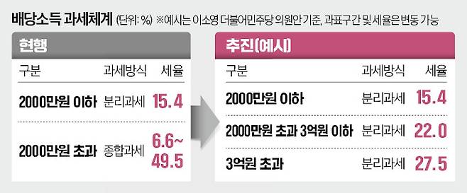 개정안에선 배당소득이 2000만원 초과 3억원 이하이면 22%, 3억원 초과 시 27.5%의 별도 세율을 적용한다. 2000만원 이하 배당소득은 기존과 동일하게 15.4%의 세금이 매겨진다. 정부 관계자는 “이 의원 안은 배당성향이 높은 기업에 한정해 분리과세를 도입하는 것이 핵심”이라며 “전면적 분리과세는 세수가 줄고 ‘부자 감세’ 논란이 있지만 이 의원 안과 같은 제한적 분리과세에는 큰 이견이 없다”고 말했다. 국정기획위와 기재부는 논의를 거쳐 과세표준과 세율을 확정할 계획이다.