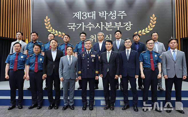 [서울=뉴시스] 최진석 기자 = 박성주 신임 경찰청 국가수사본부장이 30일 서울 서대문구 경찰청에서 열린 국가수사본부장 취임식에서 기념촬영하고 있다. 2025.06.30. myjs@newsis.com