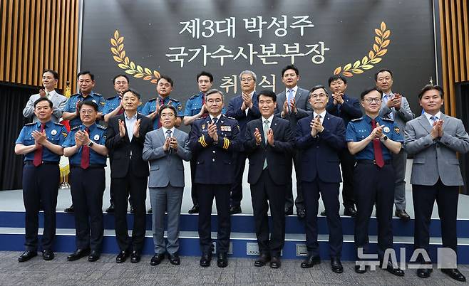 [서울=뉴시스] 최진석 기자 = 박성주 신임 경찰청 국가수사본부장이 30일 서울 서대문구 경찰청에서 열린 국가수사본부장 취임식에서 기념촬영하고 있다. 2025.06.30. myjs@newsis.com