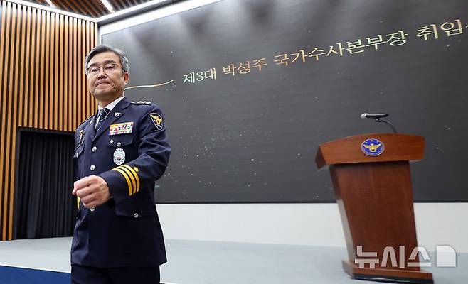 [서울=뉴시스] 최진석 기자 = 박성주 신임 경찰청 국가수사본부장이 30일 서울 서대문구 경찰청에서 열린 국가수사본부장 취임식에서 취임사를 마친 뒤 이동하고 있다. 2025.06.30. myjs@newsis.com