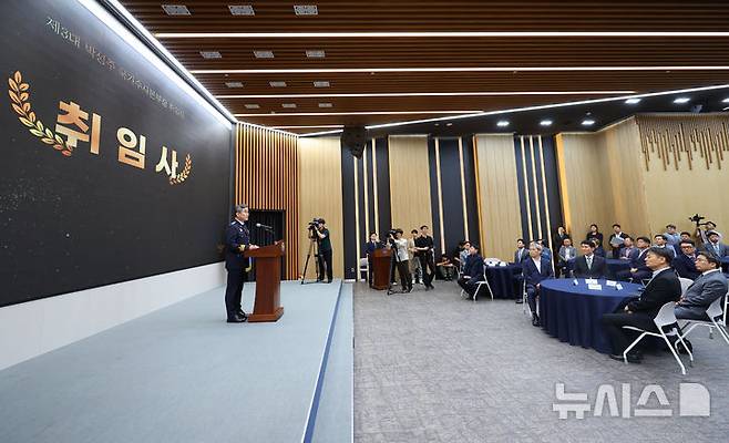 [서울=뉴시스] 최진석 기자 = 박성주 신임 경찰청 국가수사본부장이 30일 서울 서대문구 경찰청에서 열린 국가수사본부장 취임식에서 취임사를 하고 있다. 2025.06.30. myjs@newsis.com