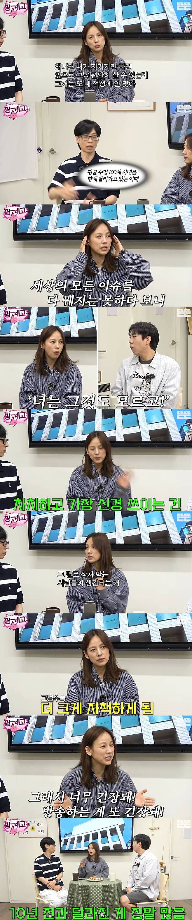 이효리는 "(방송 흐름이) 달라진 사이에 없었지 않냐. 그래서 너무 긴장된다. 방송하는 게 또 긴장된다. 예를 들어 (과거에는) 여자 가슴이 작은 것 갖고도 놀리던 시절이다. 근데 내가 그 10년을 까먹고 어디 가서 'A컵 같은데, 이런 말을 하면 어떡하지?'라고 생각하게 된다"라고 말하며 공백기로 인해 요즘 흐름을 따라가지 못할까 봐 걱정된다고 덧붙였다.
