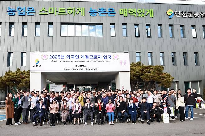 | ▲ 연천군은 지난 3월 5일 농업기술센터 3층 대강당에서 베트남 동탑성 외국인 계절근로자 59명과 26명의 농가주가 참석한 가운데 외국인 계절근로자 농가대면식을 열었다. |