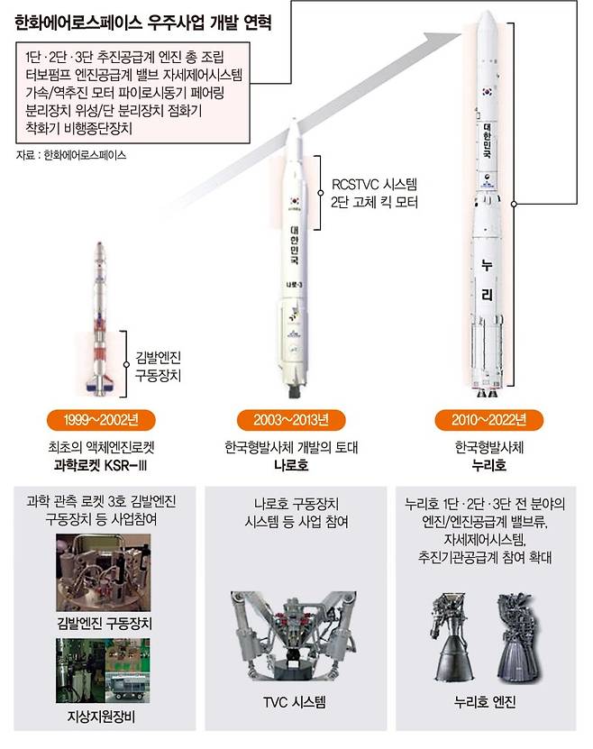 누리호는 독자적인 우주 수송능력 확보를 위해 1.5t급 실용위성을 지구 상공 600~800㎞ 저궤도에 추진할 수 있는 3단형 한국형 발사체다. 한화에어로스페이스는 누리호에 탑재되는 총 6기의 엔진 총조립을 담당하고 있다. 누리호 1단 로켓에는 75t급 액체엔진 4기, 2단에는 75t급 액체엔진 1기, 3단에는 7t급 액체엔진 1기가 장착된다.