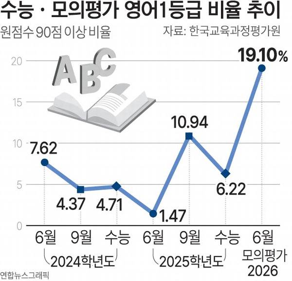 30일 한국교육과정평가원이 발표한 2026학년도 수능 6월 모의평가 채점 결과에 따르면 영어 1등급(원점수 90점 이상) 비율은 19.1%로, 절대평가로 전환된 2018학년도 이후 최고치를 찍었다. 역대 6, 9월 모평뿐만 아니라 본수능까지 통틀어 영어 1등급 비율이 가장 높았다. 지난해 6월 모평에서는 영어 1등급 비율이 1.5%에 불과했고, 지난해 수능 때는 6.22%였다. 이에 난이도 조절에 실패했다는 분석이 제기돼 본수능에서는 난이도를 다시 조절할 수 있다는 전망이 나온다.