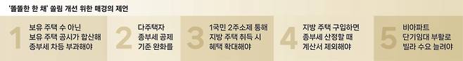 박합수 건국대 부동산대학원 겸임교수는 “보유 주택 수가 아닌 보유 주택 공시가격을 합산해 세금을 차등 부과하는 것이 조세 정의에도 맞고 지금 같은 똘똘한 한 채 현상도 막아 지방 부동산 경기를 되살릴 수 있다”고 말했다.