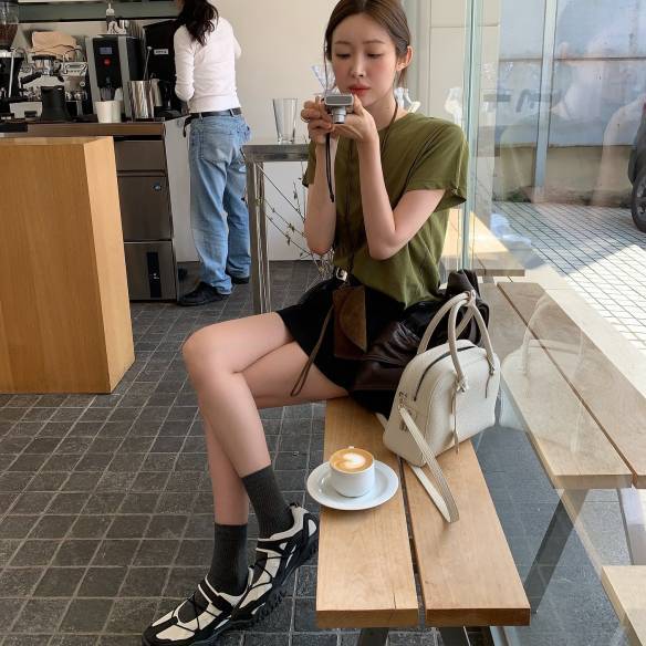 짧은 하의에 발목까지 올라오는 양말, 샌들의 조합을 즐기는 차정원 역시 시원하고 쾌적한 스니커즈 샌들의 매력에 빠진 듯 보입니다.