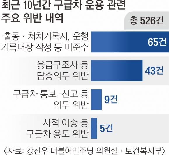 30일 서울신문이 강선우 더불어민주당 의원실을 통해 받은 보건복지부 자료를 보면 최근 10년간(2015~2024년) 전국 공공·민간 구급차 운용 점검에서 구급차를 제대로 운용하지 않아 적발된 건수는 526건이다. 지방자치단체장이 매년 최소 1회 실시하는 점검에서 적발된 경우만 이 정도 규모다.
