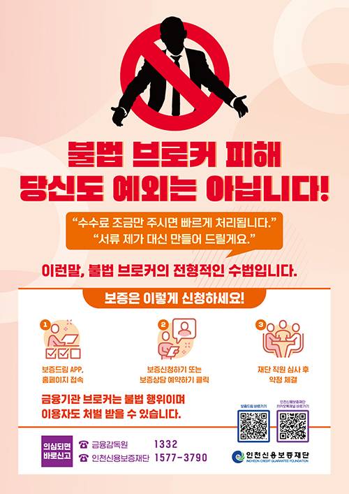 인천신용보증재단 관계자는 “각 기관들이 보증심사를 객관적으로 진행해 브로커가 대행해 준다고 해서 달라질 일은 없다”며 “보증신청에는 제 3자의 개입이 전혀 필요 없다”고 말했다.