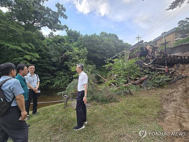 (서울=연합뉴스) 최응천 국가유산청장(가운데)가 30일 오후 화재가 발생한 서울 성북구 명승 '서울 성북동 별서' 내 송석정 현장을 찾아 관계자들과 피해현황을 살펴보고 있다. 2025.6.30 [국가유산청 제공. 재판매 및 DB금지]