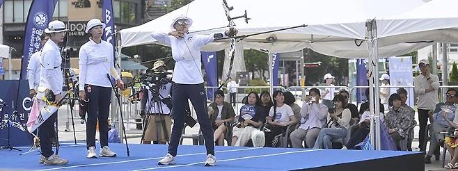 | 2025 광주 세계양궁선수권대회의 리허설 격인 ‘2025 우수 실업팀 및 해외 우수 선수 초청 국가대표 이벤트 매치’가 30일 광주 동구 5·18 민주광장 특설무대에서 열려 세계양궁선수권대회에 출전하는 여자 리커브 국가대표 안산·강채영·임시현이 단체전 경기를 하고 있다./김애리 기자·조영권 인턴 기자 |