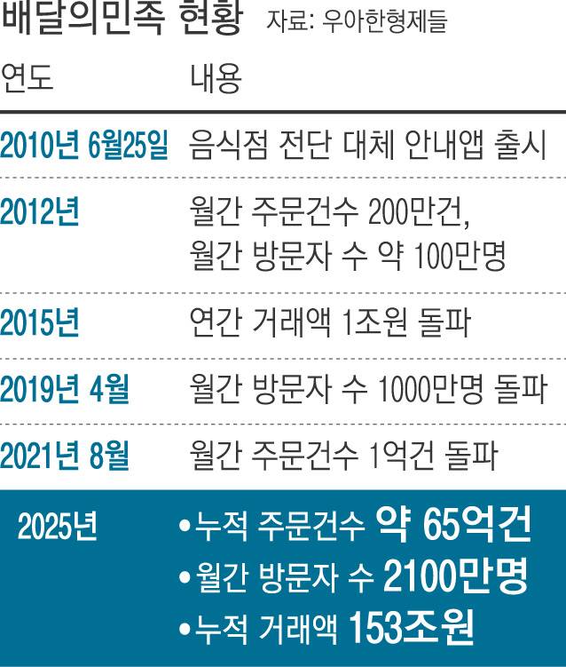 배달의민족이 애플리케이션 출시 15년 만에 누적 주문 건수 약 65억건, 누적 거래액 153조원을 넘어서는 등 승승장구하고 있다. 다만 가맹점주들의 ‘중개수수료 부담’ 호소가 계속되는 데다, 2위인 쿠팡이츠 등이 맹추격하는 등 배달 플랫폼 시장의 경쟁이 치열해지고 있어 앞으로 풀어야 할 과제가 산적해 있다.