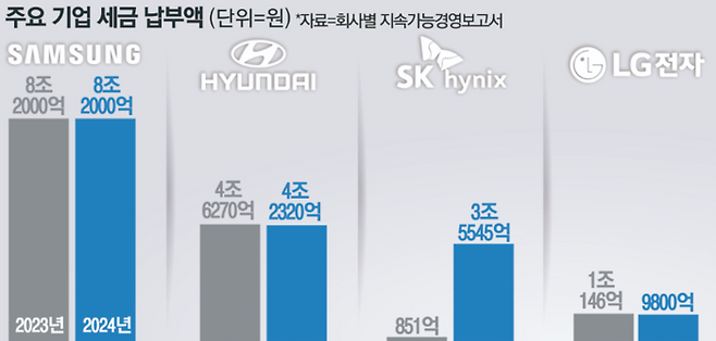 같은 기간 삼성전자와 현대차의 법인세 납부액은 동일하거나 줄어든 것으로 집계됐다. 삼성전자는 2024년도 지속가능경영보고서를 통해 조세공과금으로 2023년과 2024년 동일한 8조2000억원을 납부했다고 공시했다. 이는 2022년 13조원에 비해 줄어든 수치다. 반도체 업황 불황과 가전시장 침체 등으로 삼성전자의 경영실적이 좋지 않았던 점이 반영된 탓이다.