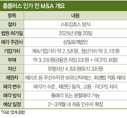 이번 M&A는 조건부 인수 계약 체결 이후 공개 경쟁 입찰로 인수 희망자를 모색하는 ‘스토킹호스(Stalking Horse)’ 방식으로 진행된다. 사전에 내정된 인수자가 기준선 역할을 하되, 공개입찰 과정에서 더 유리한 조건이 제시되면 새 인수자가 선정되는 방식이다. 매각 주관사는 삼일회계법인이다. 삼일회계법인은 법원이 지정한 조사위원으로, 앞서 홈플러스 재무 상태를 평가한 조사보고서를 법원에 냈다. 조건부 인수 계약 체결과 공개입찰을 거쳐 최종 인수자 선정까지는 2~3개월가량 걸린다.