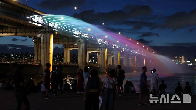 [서울=뉴시스] 최진석 기자 = 지난 밤 서울에 올해 첫 열대야가 나타난 30일 서울 반포한강공원에서 시민들이 반포대교 달빛 무지개 분수를 바라보며 더위를 식히고 있다. 2025.06.30. myjs@newsis.com
