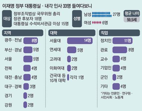 29일 매일경제가 대통령실·내각 인선을 살펴본 결과, 평균 연령은 59.5세이며 남성(78%)이 대다수였다. 지역별로는 호남(12명)이 가장 많았으며 서울대를 졸업한 인사는 14명에 달했다. 이 대통령이 유능한 정부를 강조하며 서오남 내각이 꾸려진 것으로 풀이된다.