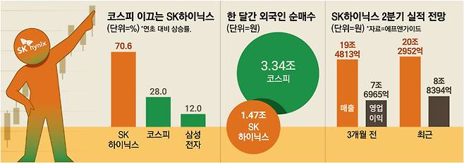 SK하이닉스가 고대역폭메모리(HBM) 경쟁력을 바탕으로 한 2분기 실적 전망 덕에 상승세를 이어가면서 코스피를 지탱하고 있다.