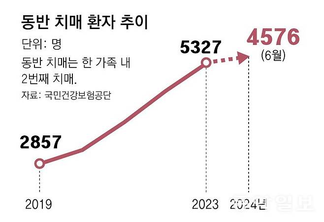 국민 20%가 65세 이상인 초고령사회에 진입하면서 부부가 모두 치매에 걸린 경우도 가파르게 증가하고 있는 것으로 파악됐다. 30일 동아일보가 국민건강보험공단을 통해 확보한 자료에 따르면 한 가족 내 2번째 치매 환자임을 뜻하는 ‘동반 치매’ 환자는 2019년 2857명에서 2023년 5327명으로 늘었다. 4년 새 약 86%가 증가한 것이다. 대다수는 노부부가 함께 치매에 걸린 경우다.