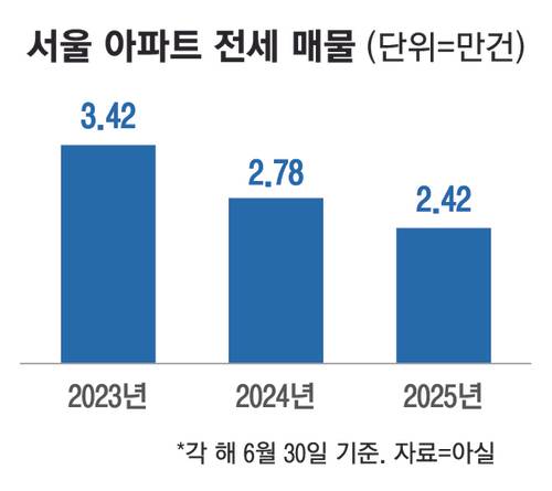 30일 부동산 정보업체 아실에 따르면 이날 기준 서울 전세 물건은 2만4279건으로 지난해 같은 날(2만7862건) 대비 12.9% 줄어들었다. 2023년 대비로는 29.1% 감소한 수치다. 특히 대규모 주거지가 밀집된 강동구와 송파구 등의 감소폭이 두드러졌다. 강동구는 1년 전(3593건)보다 77.8% 줄어든 799건을 기록했고, 송파구도 같은 기간 3073건에서 1330건으로 53.2% 감소했다.