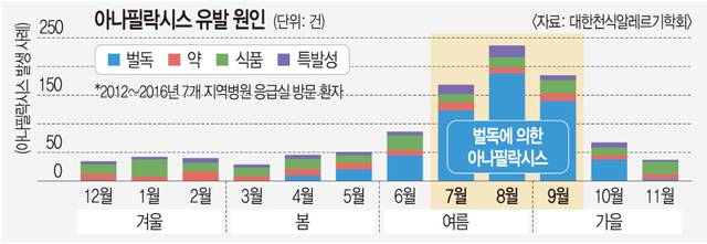 지난 30일 학회 보고서에 따르면 2012~2016년 강원도 등 7개 지역병원 응급실을 방문한 아나필락시스 환자를 월별로 살펴본 결과 벌독에 의한 사례는 4월부터 조금씩 증가했으며 7~9월에 집중적으로 발생한 것으로 조사됐다. 특히 5~10월 아나필락시스 응급실 방문의 가장 많은 부분을 벌독이 차지했다.
