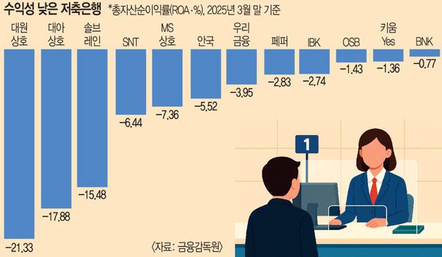 수익성도 부진하다. 지난 3월 말 기준 순자산이익률(ROA)은 0.15%에 그쳤다. 2023년 1분기 마이너스(-)가 된 뒤 아홉 개 분기 만에 반등하는 데 성공했지만 여전히 낮은 수준이다. 4년 전 ROA는 2%를 넘겼다. 이조차 평균일 뿐 대원상호(-21.33%)와 대아상호(-17.88%), 솔브레인(-15.48%) 등 두 자릿수 마이너스인 곳이 적지 않다. 우리금융(-3.95%), IBK(-2.74%), 키움Yes(-1.36%) 등 대형 금융사 산하거나 페퍼(-2.83%), OSB(-1.43%) 등 규모가 큰 곳 중에서도 마이너스인 곳이 있다.