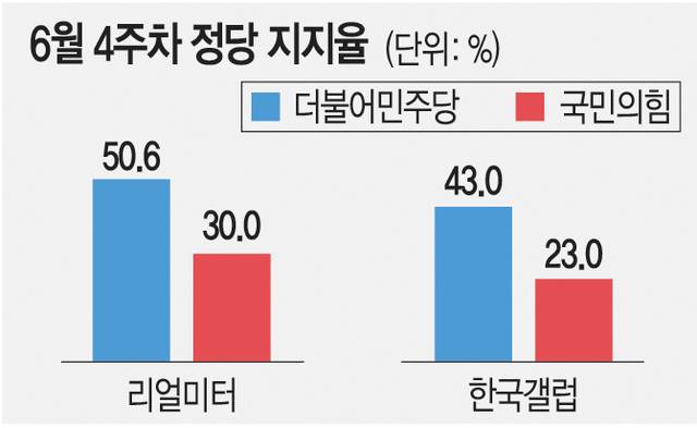 리얼미터 조사에서 민주당 지지율은 50.6%로 국민의힘(30.0%)을 20.6% 포인트 앞섰다.