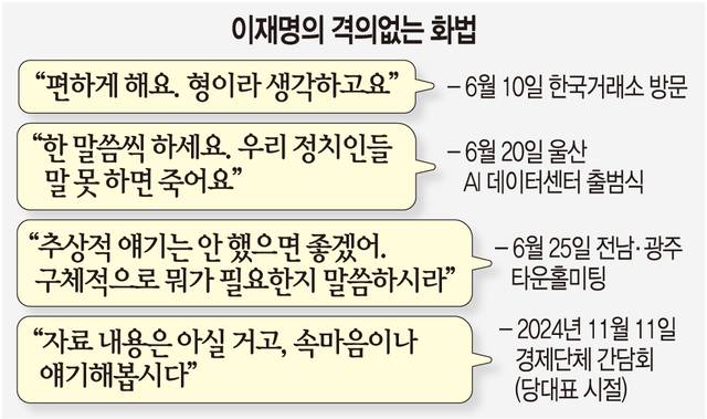 이 대통령은 대화 과정에선 작은 수첩에 일일이 메모하며 질문을 되묻거나 단도직입적인 대화를 이끌었다. 지난 25일 광주에서 열린 타운홀 미팅에선 수첩 하나 들고 2시간 동안 미팅을 진행했다. 지역 애로사항을 말한 시민과 지자체장에겐 “그건 많이 속상하셨겠다”거나 “약속된 (정부) 지원은 믿을 수 있는 거냐”고 되물었다. 인공지능(AI) 산업 유치를 위한 지원 요청엔 “추상적인 얘기는 하지 말고, 그래서 구체적으로 뭐가 필요한지 말해 달라”고 주문했다. 지난 20일 AI 관련 행사에 함께 참석한 의원들에게는 “한 말씀씩 하시라. 우리 정치인들 말 못 하면 죽는다”고 권유해 현장에 큰 웃음이 터지기도 했다.