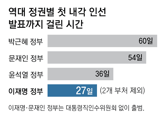 이 대통령은 집권 직후 대통령실 주요 참모에게도 “내각 구성을 빨리 하는 게 좋겠다”며 “가급적 원샷으로 발표하는 게 어떠냐”는 제안을 했던 것으로 알려졌다. 인수위 없이 출범한 문재인 정부 당시 6차에 걸쳐 장관 후보자를 나눠 지명한 것과 달리 신속한 인선에 방점을 둔 것. 이 대통령은 지난달 23일과 29일 등 2차례에 걸쳐 장관 후보자를 각각 11명, 6명 일괄 발표하면서 국토교통부와 문화체육관광부를 제외한 후보자 지명을 마무리했다.