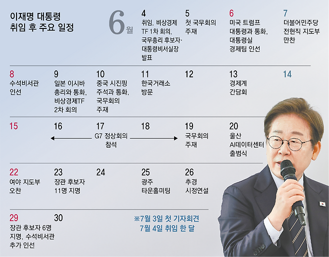 이 대통령은 대선 기간 김 후보자, 이한주 국정기획위원장 등에게 ‘집권 100일 구상’을 맡긴 것으로 전해졌다. 해당 안에는 추경을 비롯한 민생경제 대책, 비상경제점검 태스크포스(TF) 회의 개최, 주요 7개국(G7) 정상회의 등 주요 일정이 포함됐던 것으로 알려졌다. 대통령실 관계자는 “인수위 없이 출범한 문재인 정부의 일정을 주로 참고하면서 위기 대응에 초점을 맞췄다”고 했다.