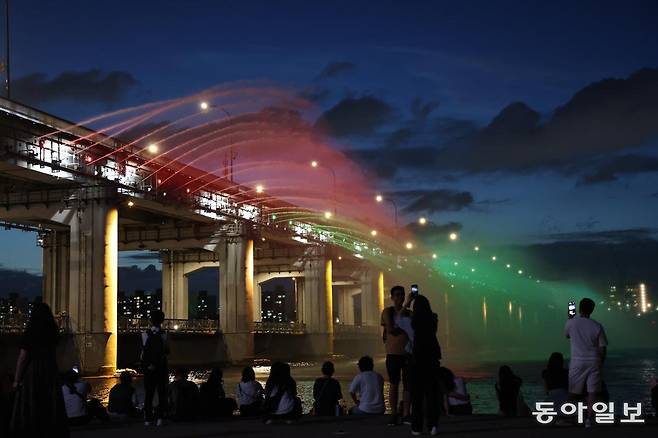 | 한강공원서 더위 식히는 시민들 서울에 올해 첫 폭염주의보가 내려진 30일 서울 한강 반포대교 무지개분수 앞에서 시민들이 더위를 식히고 있다. 서울에선 전날인 지난달 29일 올해 첫 열대야가 발생해 2022년부터 4년 연속 ‘6월 열대야’가 관측됐다. 양회성 기자 yohan@donga.com |
