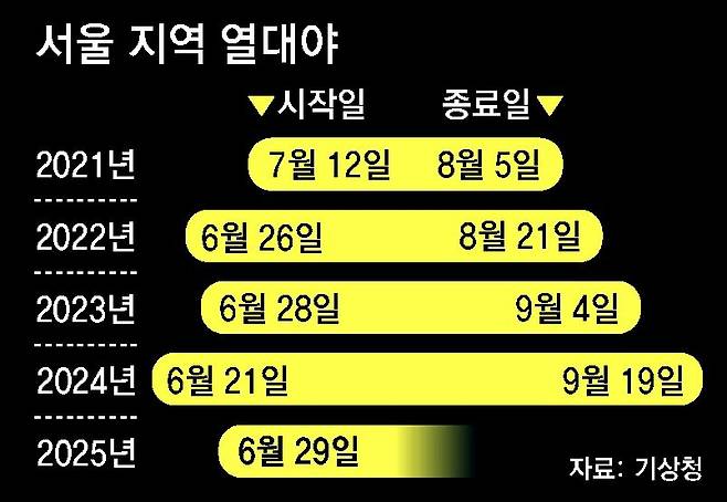 열대야 기간은 갈수록 길어지고 있다. 서울의 경우 2019년 17일, 2020년 13일 수준이었던 열대야가 2023년 25일로 늘었다. 지난해에는 역대 최장인 48일을 기록했다. 열대야는 시작이 6월로 빨라지고 종료는 9월 중순으로 늦춰졌다. 2022년까지는 8월에 마지막 열대야가 발생했지만 2023년 9월 4일, 지난해에는 9월 19일까지 열대야였다.