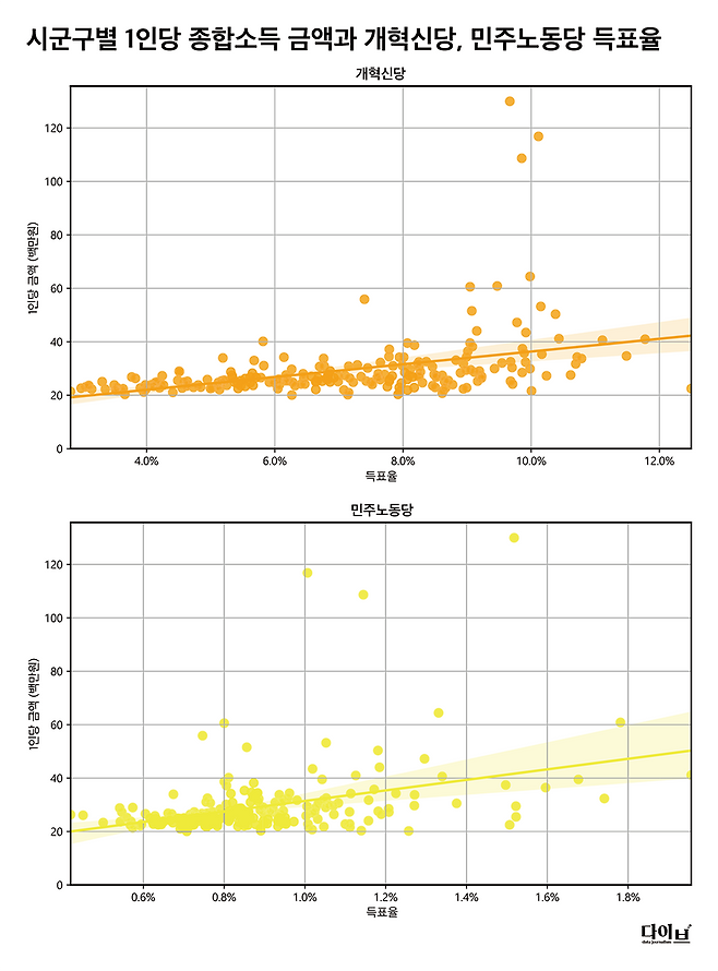 두 후보의 또 다른 공통점도 있었다. 시군구별 1인당 종합소득금액과 4개 정당의 득표율을 비교했더니 더불어민주당과 국민의힘은 유의미한 상관관계가 나타나지 않았지만 개혁신당과 민주노동당은 대체로 소득이 높을수록 득표율도 높아지는 것으로 나타났다. 개혁신당은 1인당 종합소득금액과 0.402의 상관계수를, 민주노동당은 0.376의 상관계수를 나타냈다.
