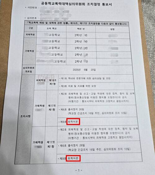 ▲ 학폭심의위 결정 통지서