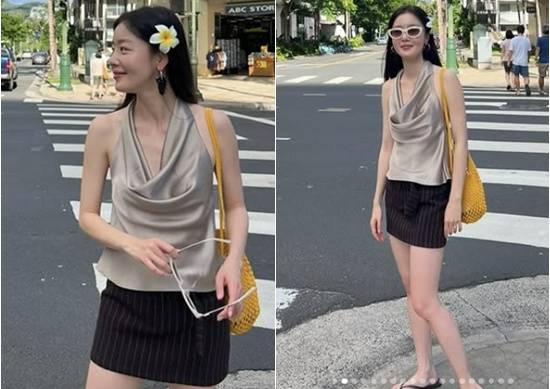 이날 한선화는 은은한 광택의 실크 드레이핑 톱과 브라운 핀스트라이프 미니스커트를 매치해 감각적인 휴양지 스타일을 선보였다.