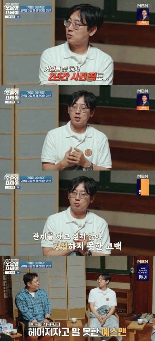 '예스맨'은 "학창 시절에 거절을 못 해서 2년간 사귄 적도 있었다. 같이 지내는 건 너무 좋았기 때문에 관계를 깨고 싶지 않았다. 사랑이 아닌 걸 알지만 헤어지자고 말하지 못했다. '이대로 결혼해야 하나' 싶었다"라고 말해 모두에게 충격을 안겼다.