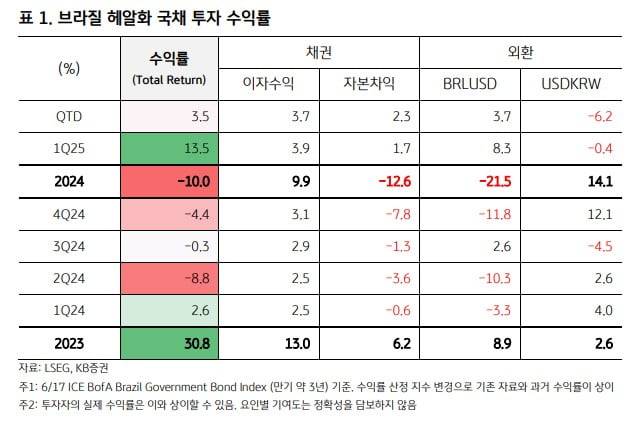 올해 2분기 브라질 10년물 채권에 투자한 투자자들은 약 3%의 수익률을 기록했을 것으로 추정됩니다. 브라질 정부의 금리인상에도 불구하고 높은 이자수익과 자본차익 덕분에 양호한 수익률을 냈습니다.
