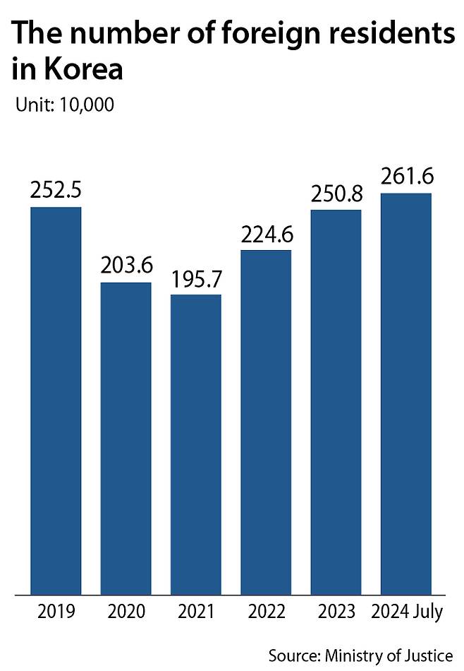 The number of foreign residents in Korea has been steadily increasing, reaching around 2.62 million as of July 2024, or 5 percent of the total population, according to Ministry of Justice data. It estimates that the figure could surpass 3 million in 2026.
