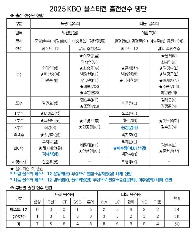 이에 따라 드림 올스타 외야수 총점 4위를 기록한 삼성 김지찬이 윤동희를 대신해 베스트 12로 나서며, 나눔 올스타 에서는 3루수 부문 2위 키움 송성문, 외야수 부문 4위 키움 이주형이 각각 김도영과 플로리얼을 대신해 베스트 12 선수로 올스타전에 참가한다.